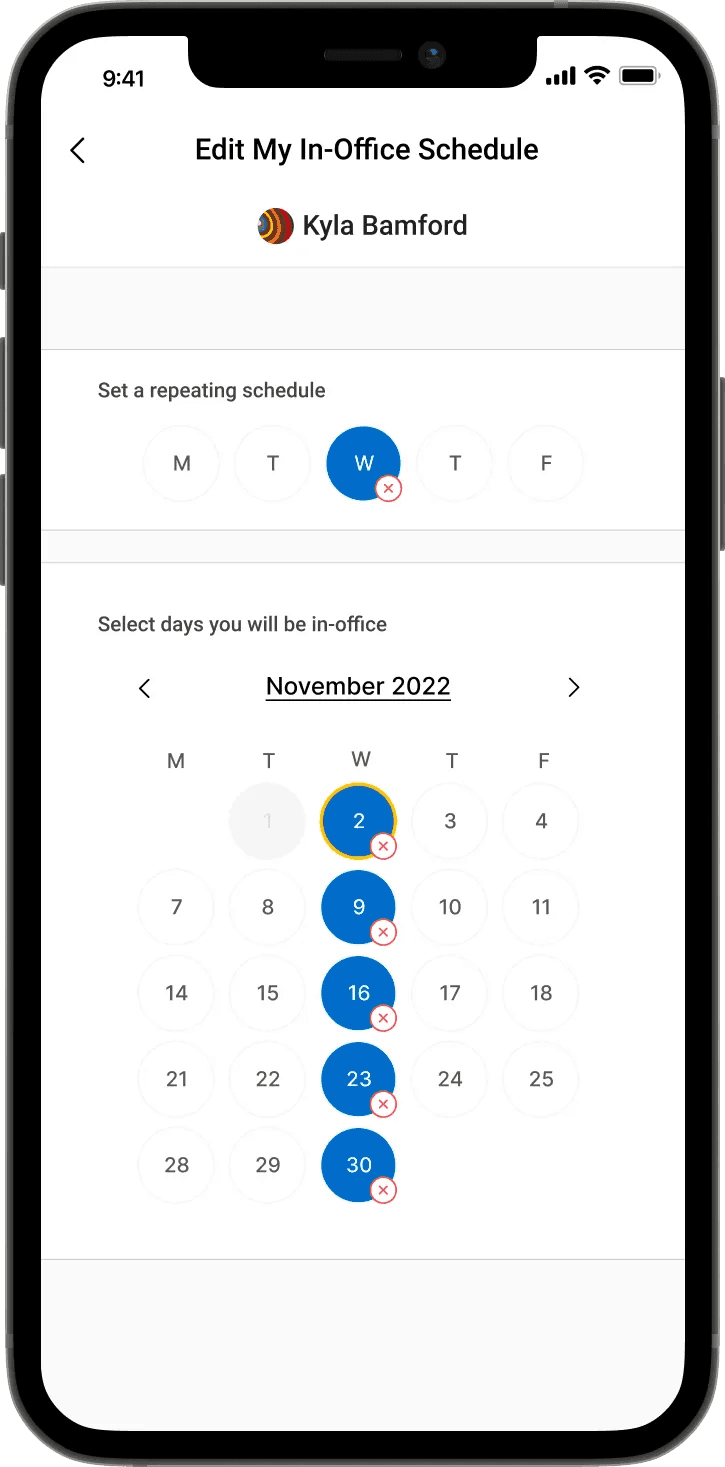 92% of the users said they wanted a year long calendar so they could input in-office days. However, through the metrics we found that less than 10% of users set their schedule past 3 weeks.